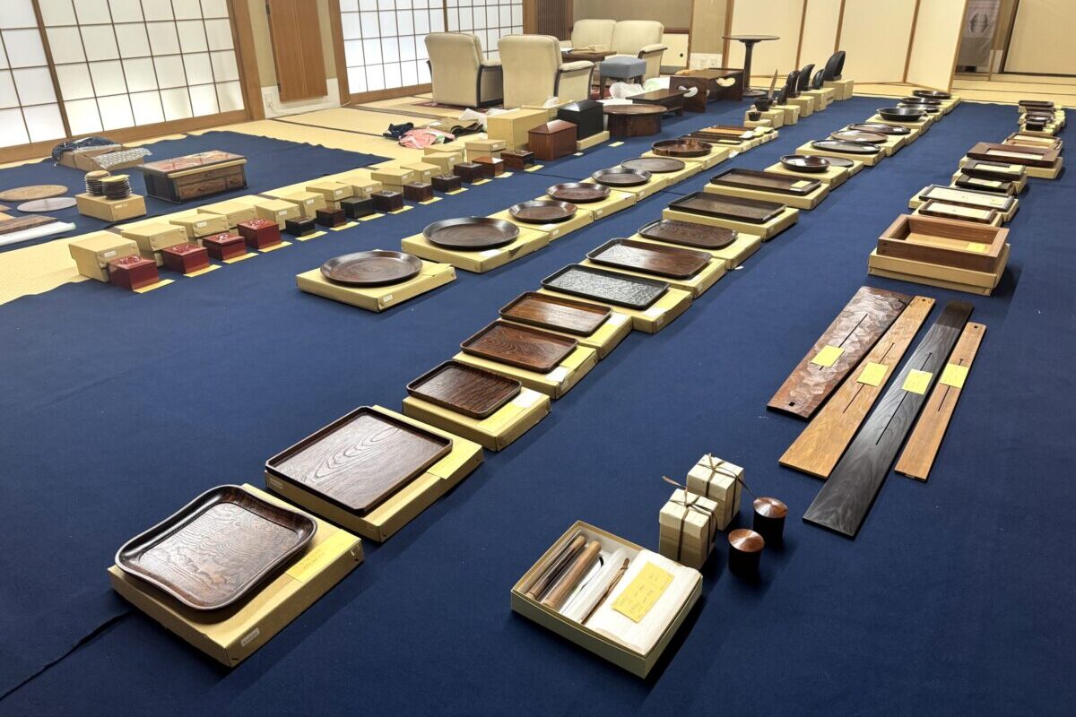 工房に残されていた作品を車2台で運び出し、広間に一旦すべて広げます。ここからスタジオに一つ一つ持ち出して順繰りに撮影を行なっていきます。お盆、茶道具、小箱など9つに類別を行い、カテゴリーごとに同じ構図となるように撮影を行いました。